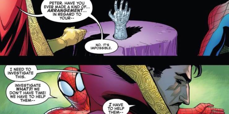 When an attempt to locate Kindred on the Astral Plane using the Hand of Vishanti goes wrong, Doctor Strange comes close to concluding what really happened here. Though he never mentions Mephisto by name, Stange still asks Spider-Man whether he "ever made a kind of… arrangement" that could disrupt the spell, harkening back to the fallout of his own deal with Mephisto in a previous storyline. It's worth noting that Doctor Strange was amongst the many Marvel figures Peter Parker sought out in hopes of saving Aunt May's life during "One More Day" and even made a joke to Spider-Man about the risks of dealing with demons after May recently told Peter that she had cancer. But where that Strange inadvertently nudged Peter into making a stupid pact with a demon, this Strange, fully aware of the harm Mephisto can do, might theoretically use his sorcery to uncover the deal's existence.
