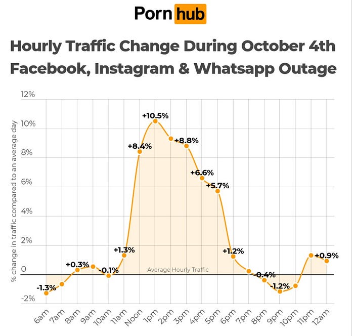 According to Pornhub, there was one thing that people turned to in order to get turned on. The graph highlights how much traffic increased during the outage compared to a typical day.