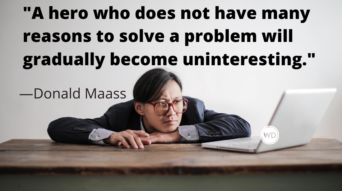 A hero who does not have many reasons to solve a problem will gradually become uninteresting. As the story grinds on, the reader will wonder, Why go through all that grief if you don’t have to? Why not just let someone else handle it? You don’t want that. You want your reader to hope hard or even cheer for your protagonist’s success, right?